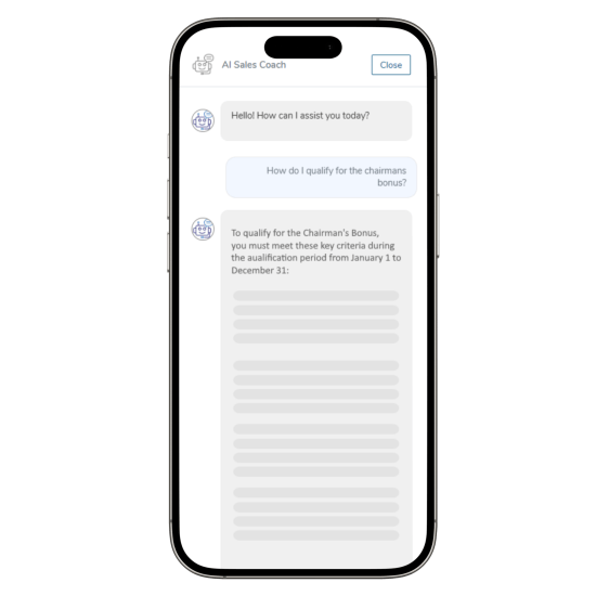 Eliminate sales training gaps and inconsistency. Our AI-powered platform delivers a personalized daily action plan, instant answers to complex questions, and smarter follow-up suggestions for every single distributor.